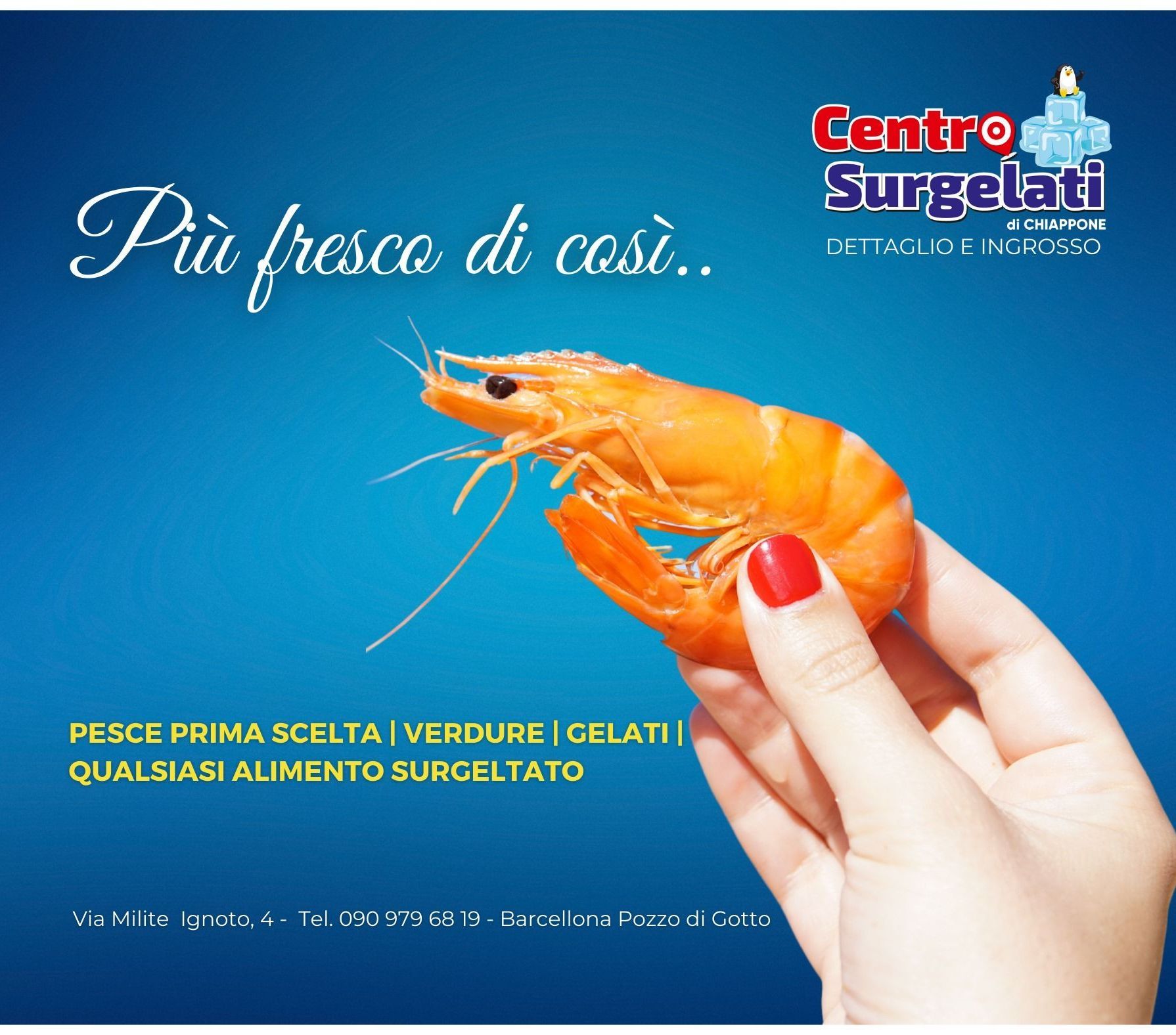 Il Centro Surgelati Chiappone è una realtà commerciale ben nota a Barcellona Pozzo di Gotto e in tutta la provincia di Messina, per via dell’alto livello di qualità dei prodotti che distribuiamo e per la cortesia e la professionalità che da sempre contraddistinguono il nostro lavoro. Da noi potrete acquistare una grande varietà di pesce surgelato, tra cui polpa di riccio, baccalà, salmone, vongole, pesce spada, gamberoni e moltissime altre specialità di cui è ricco il nostro mare. Siamo specializzati nella vendita all’ingrosso di pesce e frutti di mare, garantendo a voi clienti sempre il massimo della qualità del prodotto acquistato. Fornitori ufficiali Patate Pizzoli e leader nella vendita e distribuzione di Ghiaccio Alimentare, sia in versione cubetti che tritato. Stai bevendo un cocktail in provincia di Messina? Il ghiaccio è quello nostro!